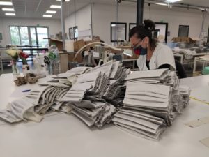 C’est ainsi que ADL Décoration (22), spécialiste dans la décoration et l’aménagement d’intérieur pour camping-car, mobil-home mais aussi gîtes et CHR, a reconverti ses 35 salariés et remplacé les rideaux de mobile home par des masques en tissu. A aujourd’hui, l’atelier aura tourné à 90 % pour les masques et 10 % pour ses autres activités. C’est 60 070 masques produits et livrés au 11 mai.