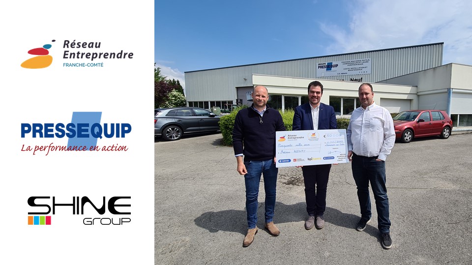 Edouard SASSARD, Administrateur de Réseau Entreprendre® Franche-Comté et Sylvain GROSDEMOUGE, Président de SHINE GROUP, lancent officiellement l’accompagnement de notre lauréat Antoine BOINAY, dans le cadre du projet de reprise de l’entreprise PRESSEQUIP située à Dannemarie-sur-Crête (25). L’entreprise est spécialisée dans la conception et la fabrication de machines spéciales, dans le but d’imaginer des solutions globales innovantes pour les projets industriels 4.0.