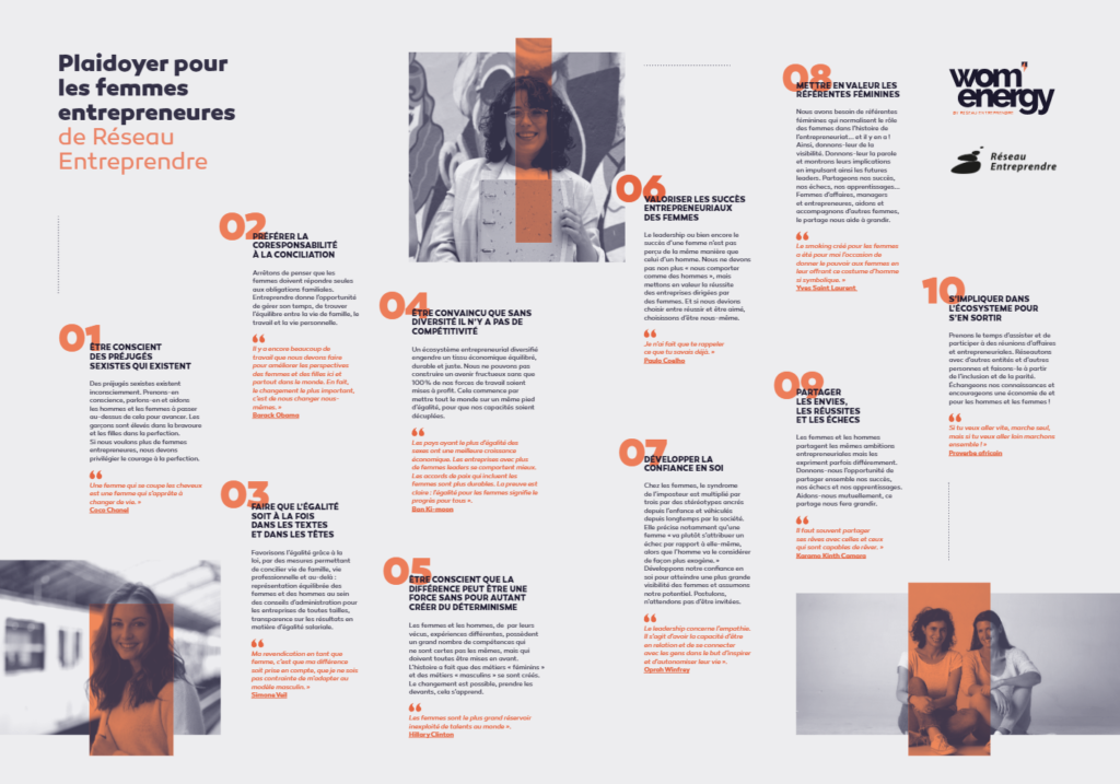 Wom’Energy, c’est l’accompagnement des femmes entrepreneures au sein de Réseau Entreprendre, dans un esprit d’équité individuelle et de souplesse, notamment sur les critères de création d’emplois. Réseau Entreprendre porte le plaidoyer des femmes entrepreneures et s’engage en 10 points à favoriser l’entrepreneuriat féminin.