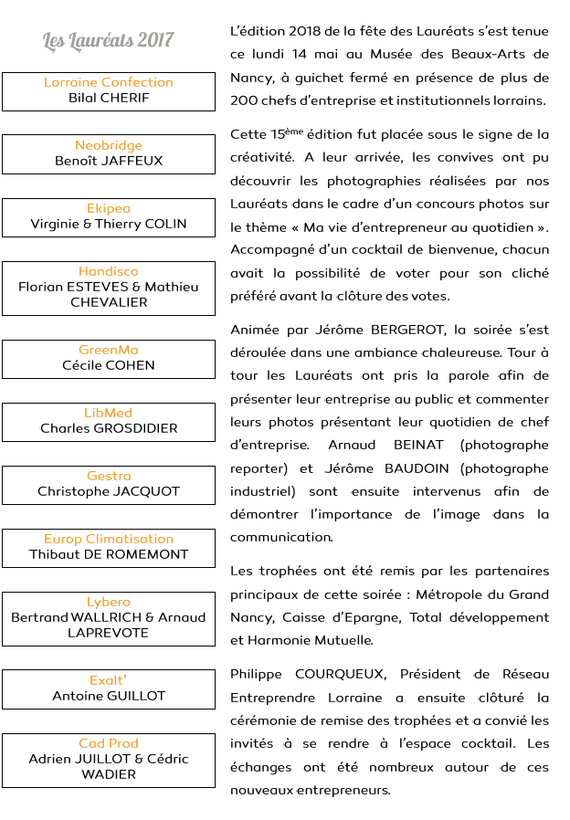 Réseau Entreprendre > Réseau Entreprendre Lorraine > Actualités > Actualités > Fête des Lauréats 2018 au Musée des Beaux-Arts à Nancy