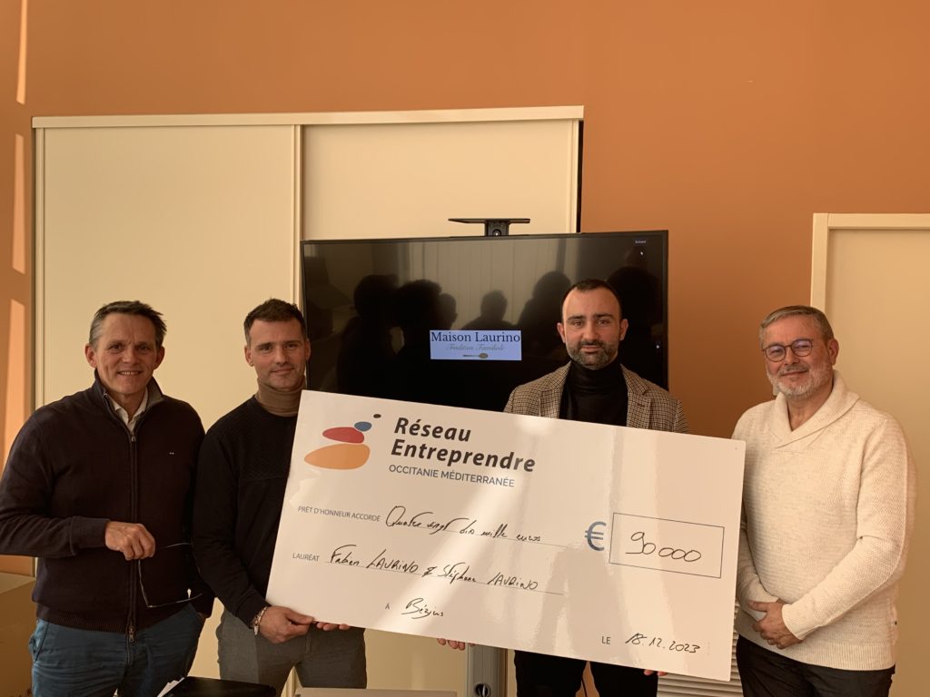 Le comité d’engagement de Réseau Entreprendre Occitanie Méditerranée a validé, le 18 décembre 2023, les candidatures de Fabien LAURINO (à droite au centre sur la photo) et Stéphane LAURINO (à gauche au centre sur la photo) pour le développement de leur entreprise FS CREATION/MAISON LAURINO. Ils vont bénéficier de l’accompagnement de Mark BROUWERS (à gauche sur la photo) et Philippe LE STRAT (à droite sur la photo), membres de l’association, pendant une durée de 2 ans et d’un prêt d’honneur de 90 000€ (dont 30 000€ de BPI).
