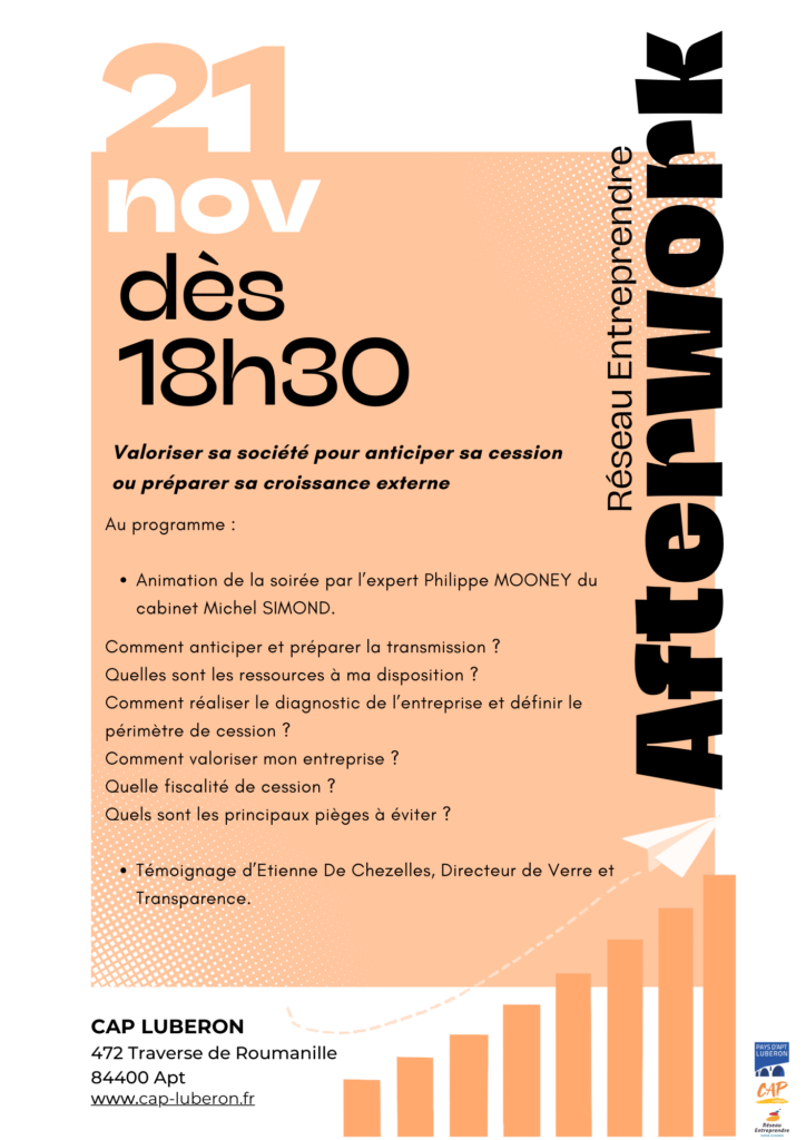 Réseau Entreprendre > Réseau Entreprendre Rhône-Durance > Actualités > Actualités > After Work « Comment valoriser sa société pour anticiper sa cession ou préparer sa croissance externe
